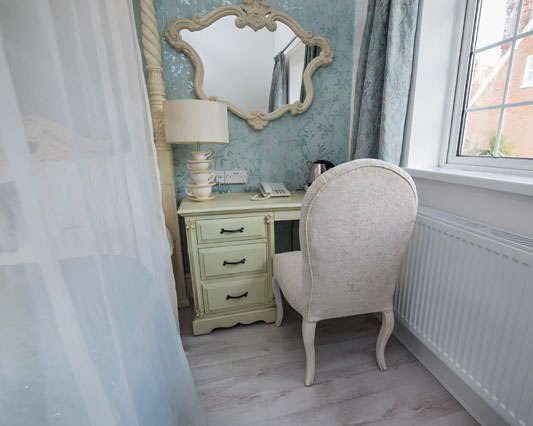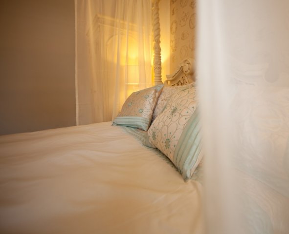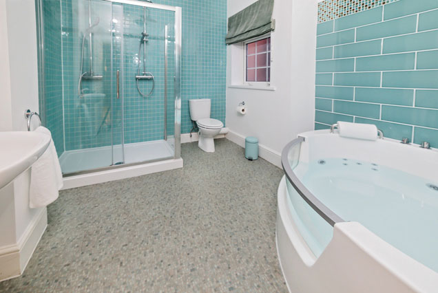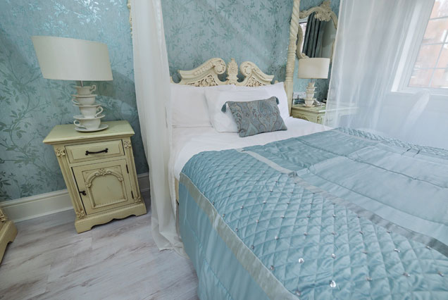 Glad To Be Here is a traditional luxury room with a four poster bed and a separate seating area and the en-suite boasts two-person jacuzzi and a separate double shower.